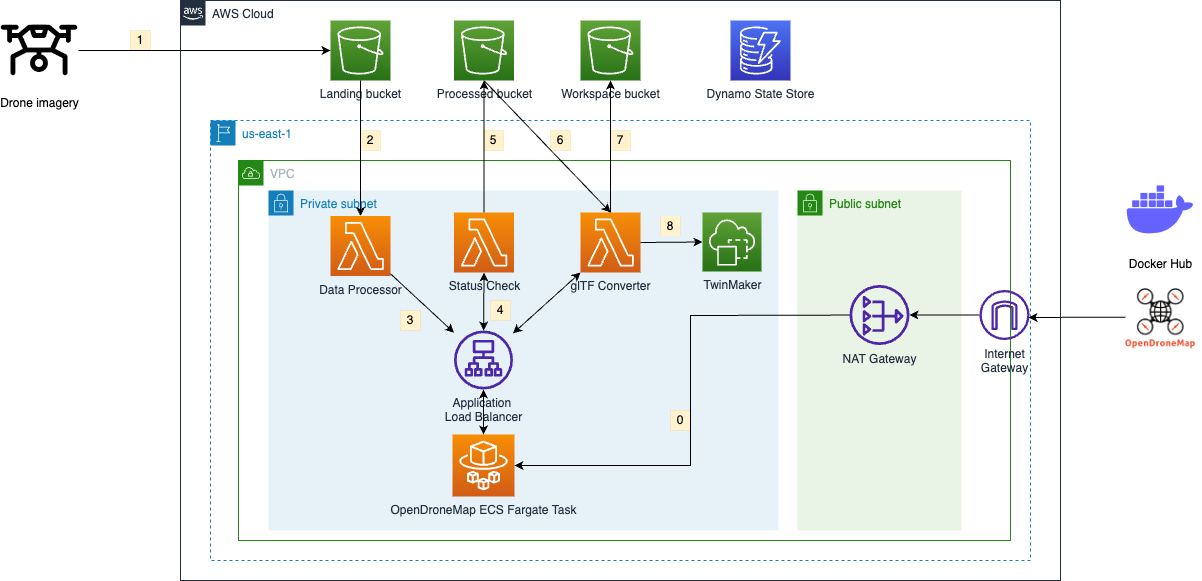人気のオープンソースである OpenDroneMap プラットフォームの NodeODM コンポーネントを活用して、座標情報が組み込まれた画像を完全にサーバーレスで処理する写真測量処理パイプラインを作成しました。パイプラインはコンピューティングに AWS Fargate と AWS Lambda を活用し、OpenDroneMap によって作成された 3D モデルを含む AWS IoT TwinMaker シーンを出力として作成します。