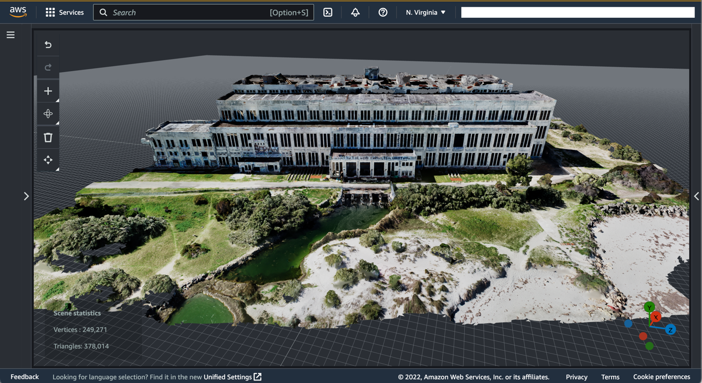 写真測量処理パイプラインの実行が完了すると、図 5 に示すように、AWS IoT TwinMaker ワークスペースに対象のアセットについて生成された 3D モデルを含む新しいシーンが作成されます。