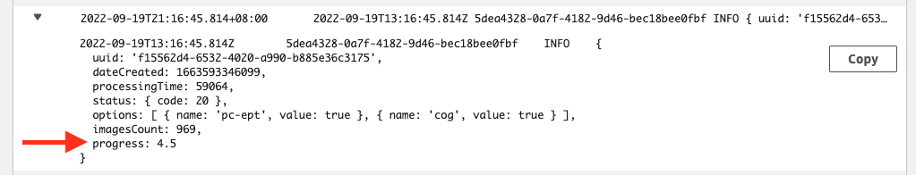 写真測量処理パイプラインは、座標情報が組み込まれた画像を含む zip ファイルをアップロードすると自動的に開始されます。処理ジョブには 1 時間以上かかることがあります (提供された画像の数、Fargate 処理タスクで提供される CPU とメモリによって異なります)。ジョブの進行状況は、ステータスチェック Lambda の Amazon CloudWatch ログ内のステータスを確認することで追跡できます。処理中のジョブがアクティブになると、ステータスチェック Lambda は (5 分間隔の) ジョブ実行時にステータスを出力します。出力には、以下に示すように、処理ジョブの進行状況がパーセンテージ値として含まれます。