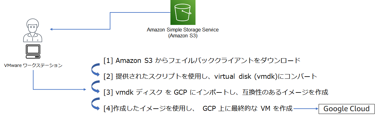 フェイルバッククライアントは livecd.iso 形式で保存されています。livecd.iso 形式は GCP 上の VM (Virtual Machine)起動に使用できず、このソリューションで使用できません。これを解決するために、 GCP 上で使用できる仮想ディスクへ変換します。変換処理では、 Linux Kernel のインストール、 Grand Unified Bootloader (GRUB) の設定ファイル(grub.cfg)の生成および、仮想ディスクへ GRUB をインストールします。変換処理のアウトプットは仮想ディスク(VMDK) となります。この仮想ディスクを用いて GCP に互換性のあるイメージ(こちらも確認下さい)を作成し、フェイルバック VM の作成に使用します。