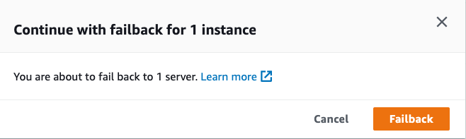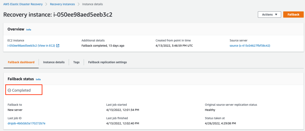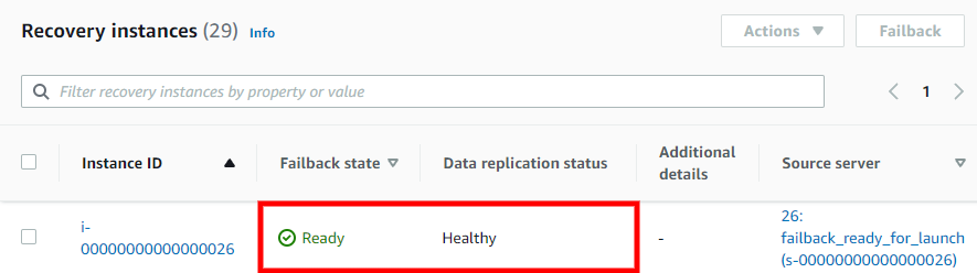 フェイルバックを計画しているすべてのリカバリインスタンスが上記のようなステータスとなった後、各インスタンス ID の左側にあるチェックボックスにチェックを入れます。その後、 Failback をクリックします。これによって、データレプリケーションが停止し、変換処理が開始されます。フェイルバック処理が終了すると各リカバリインスタンスのレプリカが対応するソースサーバー上に作成されます。