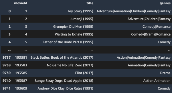 次に MovieLens のデータセットの中から movies.csv をアイテムデータセットとして Feature Store にインポートしていきます。SageMaker Python SDK は AWS SDK をラップしている SageMaker のための開発ライブラリで、SageMaker 全般の機能を抽象化し、簡単に実装することができます。