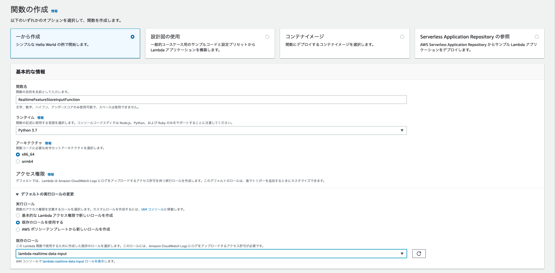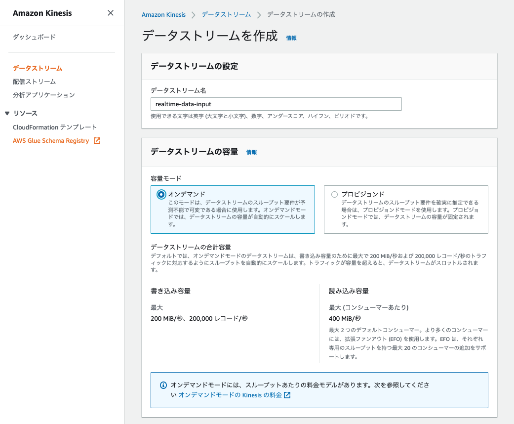 - ストリーム:Kinesis Data Stream で作成したストリーム名(今回は realtime-data-input )