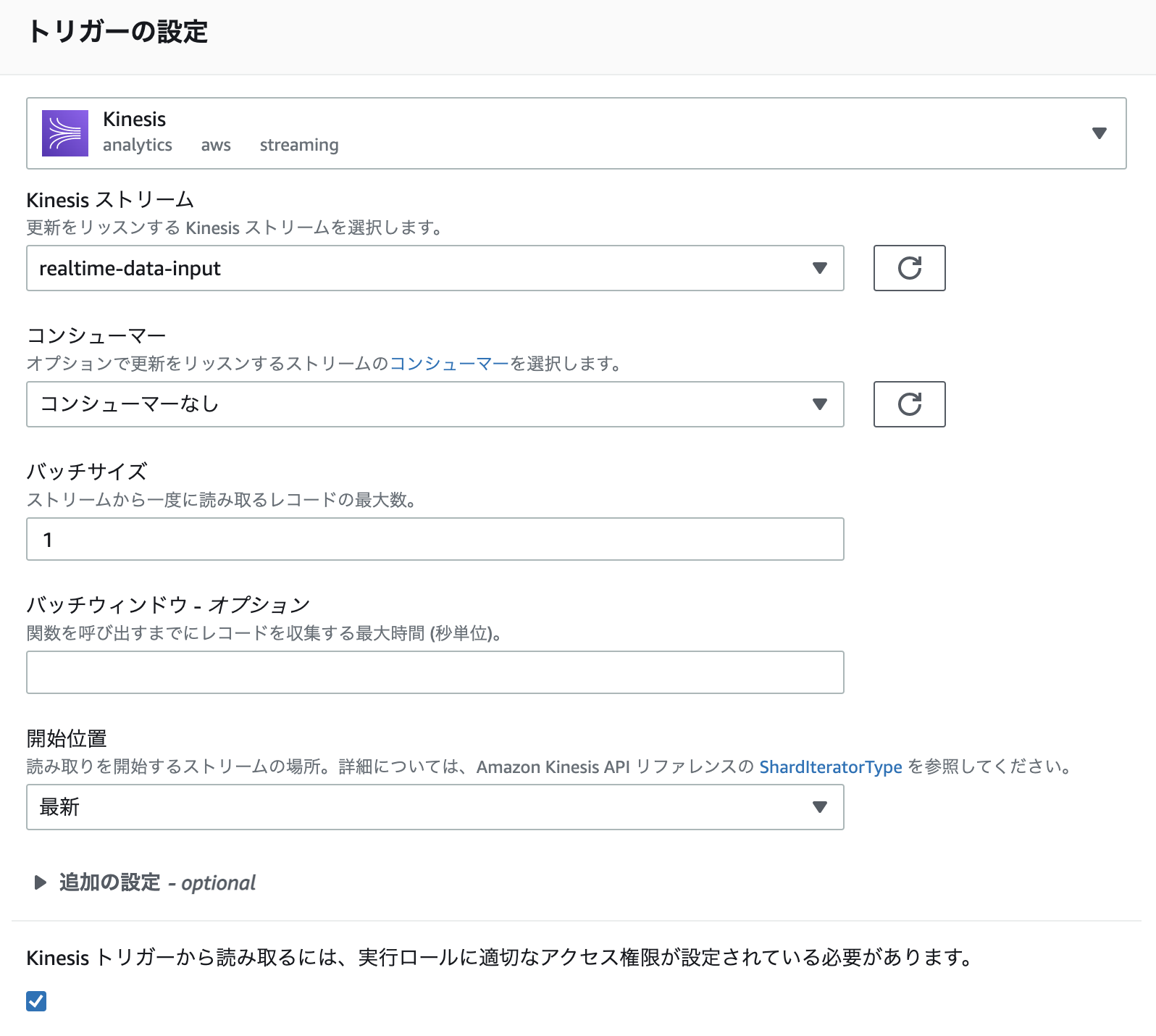 - トリガーリソース:Kinesis