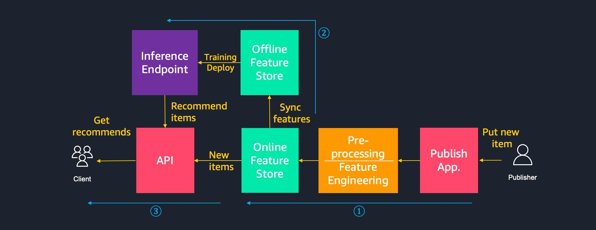 - Publisher がアイテムを投稿するとアイテムの前処理と特徴量抽出が行われ、特徴量をオンラインストアに格納するパイプラインが実行されます。