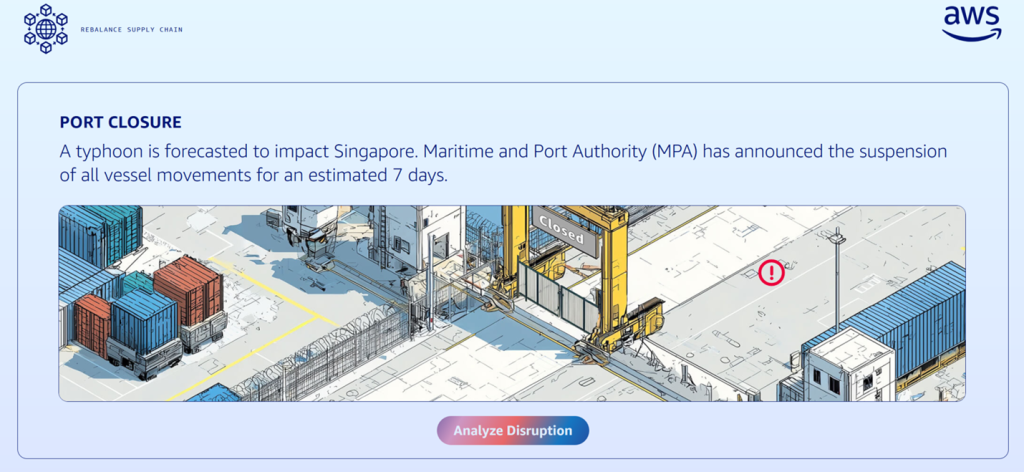 図 1 に示されるように、システムは小売ユースケースと港湾閉鎖を混乱として特定しました。このシナリオでは、台風がシンガポールに影響を与えることが予想されます。画面は分析プロセスの開始を促す混乱イベントのシミュレーションを示しています。