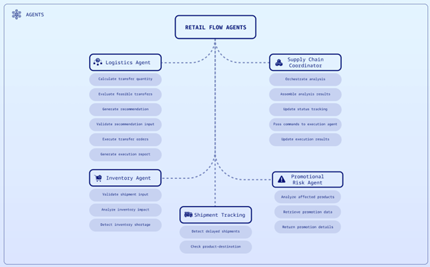 図 3 は、小売シナリオにおける相互作用戦略とともに、各専門エージェントとそれぞれのタスクを示しています。サプライチェーンコーディネーター・エージェント、ロジスティクス・エージェント、在庫エージェント、プロモーションリスク・エージェント、および出荷追跡エージェントが、マルチエージェント連携に含まれています。