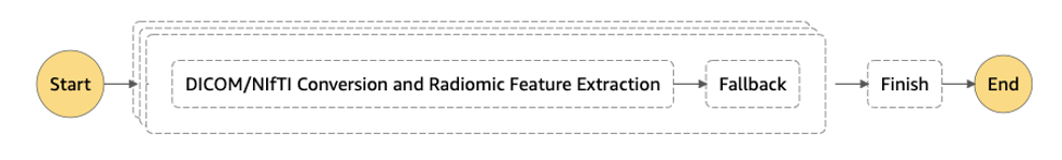2つのPythonスクリプト imaging/src/dcm2nifti_processing.pyと imaging/src/radiomics_utils.py を使用して、データセットにスタディIDを指定して1つのスタディを処理できます。臨床研究で一般的に見られるように、数百または数千のスタディにスケールするには、スクリプトのスケーラブルで伸縮性のある実行のためにSageMaker Processingを使用し、AWS Step Functionsをスタディの並列処理のためのオーケストレーションレイヤーとして使用します。