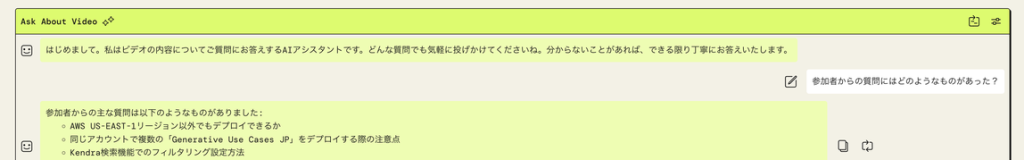「Ask About Video」で会話できる生成 AI は「Video Transcript」と「Video Summary」の内容を知った上で会話してくれるのがポイントです。「Ask About Video」の右上の設定アイコンからプロンプト (生成 AI に与えられる入力) を見てみると、「Video Transcript」と「Video Summary」を参照しているのがわかります。