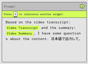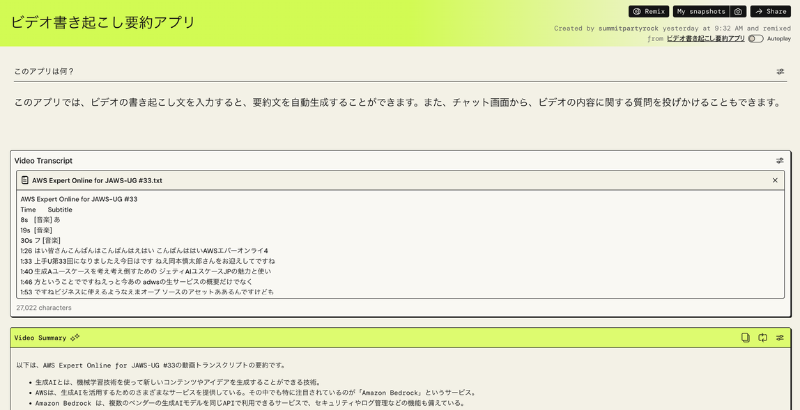 このアプリでは、ビデオの書き起こし文を入力すると、要約文の自動生成および内容に関する質問回答を行なってくれます。PartyRock を用いるとこのような実用的なアプリも簡単に素早く作成することができます。