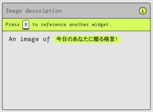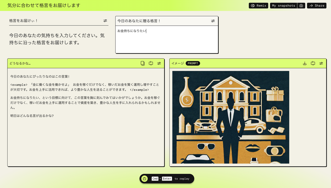 「今日のあなたに贈る格言!」に今日の気分を入力すると、その内容に合わせた格言と画像が「どうなるかな…」と「イメージ」にそれぞれ表示されます。「イメージ」のプロンプトを見ると、「今日のあなたに贈る格言!」の内容から画像を生成していることがわかります。