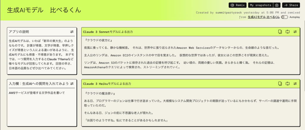 このアプリでは、Amazon Bedrock で使える複数の生成 AI モデルの出力を見比べることができます。PartyRock を使うと手軽に Amazon Bedrock のモデルを試すことができます。