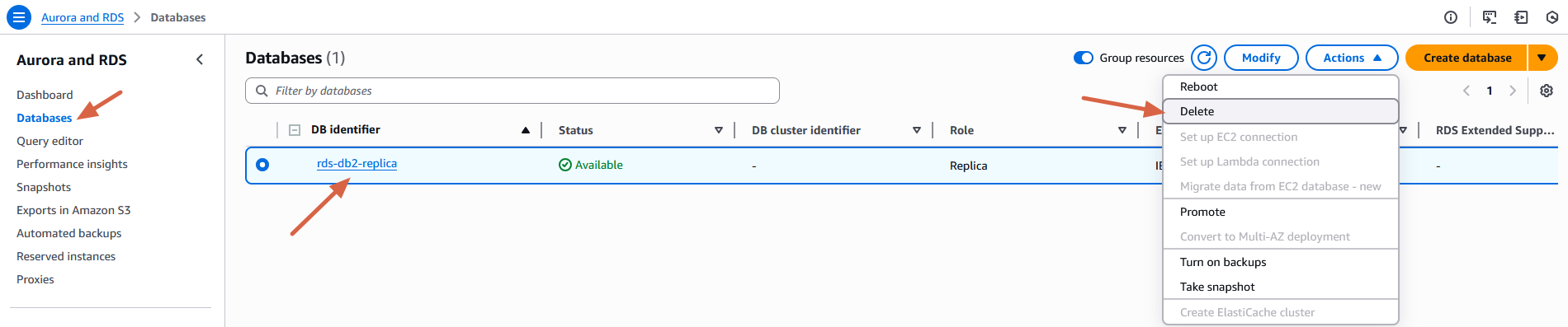- Amazon RDS コンソールのナビゲーションペインで、Databases を選択します。