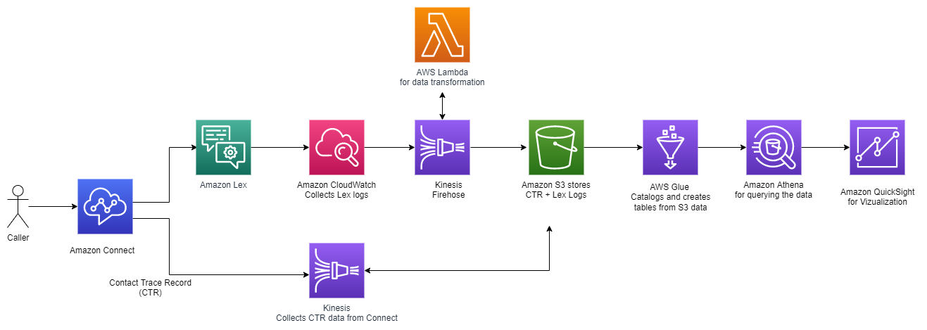 多くの組織は、デジタルカスタマーエクスペリエンスの提供のためにチャットボットのパフォーマンスレポートを生成する機能を望んでいます。Amazon Lex は、Amazon Connect で使用されるチャットボットの自然言語理解 (NLP) エンジンです。Amazon Lex ログを問い合わせ追跡レコード (CTR) および会話ログに関連付けることで、これらの組織はチャットボットの問題を特定し、NLP エンジンを調整し、顧客の感情を理解し、チャットボットのパフォーマンスを向上させることができます。CTR は、保留時間、待機時間、エージェントの対応時間などのトランザクションメトリクスをキャプチャしますが、Amazon Lex の会話ログには、発信者の発話、NLP 信頼スコア、センチメントスコア、インテント名などがキャプチャされます。