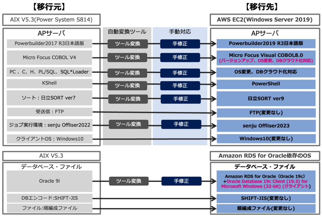 商品マスター管理システムは、IBM AIX 上で稼働しており、Micro Focus COBOL や、KornShell などレガシーなシステムとなっていた。また、対象システムは100万ステップ近くのプログラムとなっており、まずは老朽化したシステムのクラウド化への移行を優先し、その後次期システム構想に向けたモダナイゼーションを実施することとした。AWS 上のシステム構成としては、Amazon EC2(Windows Server 2019)、Amazon RDS for Oracle(Oracle 19c)を中心にしつつ、KornShell から PowerShell への変更、Micro Focus COBOL の新バージョン対応、Oracle 9i からOracle 19c への対応など古い資産の改善も図った。