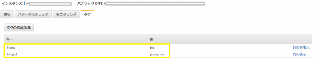 もしタグを付与したEC2と同じ請求グループとして管理されたい場合には、先ほどのEC2とまったく同じものを付与いただきます。