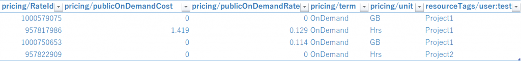 そのタグを付与したリソースで料金が発生していると、レポート上の表示ですが、キーがカラムである「resourceTags/user:test」といった形で表示され、
