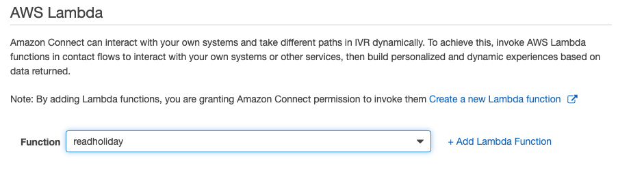 - 以下のスクリーンショットのように、関数のドロップダウンメニューで readHoliday 関数を選択し、+Add AWS Lambda Function をクリックします