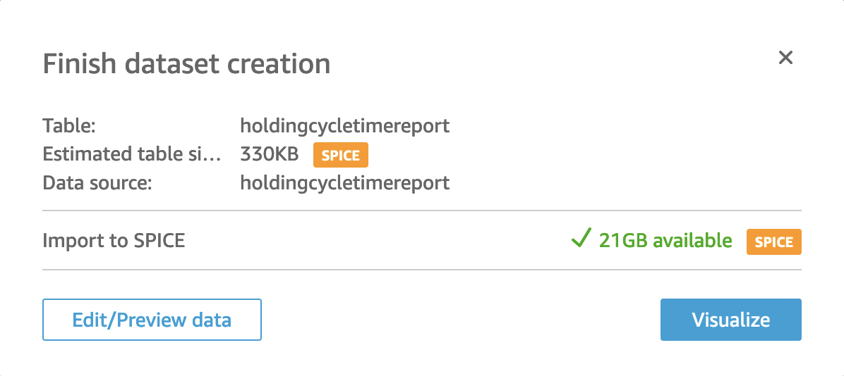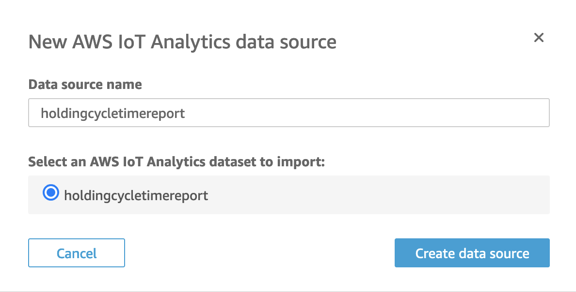 Amazon QuickSight コンソールを開いて新しい分析 (New Analytics) を選択し、データセットの選択を求められたら、新しいデータセット (New Dataset) を選択して新規データソースと接続します。AWS IoT Analytics を選択し、前のステップで作成した holdingcycletimereport という AWS IoT Analytics データセットを選択します。データソースを作成するには、データソースの作成 (Create Data Source) を選択します。
