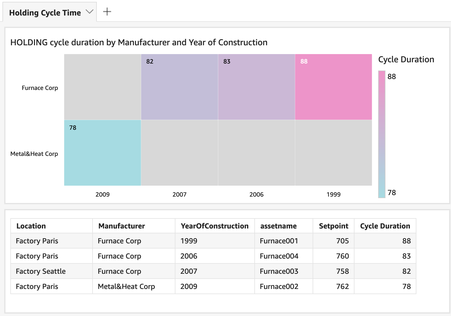 作成したビューを見ると、1999 年に Furnace Corp によって製造された炉はサイクルタイムが最も長く (88 秒以上)、優先的に設備更新する必要があることが明確にわかります。