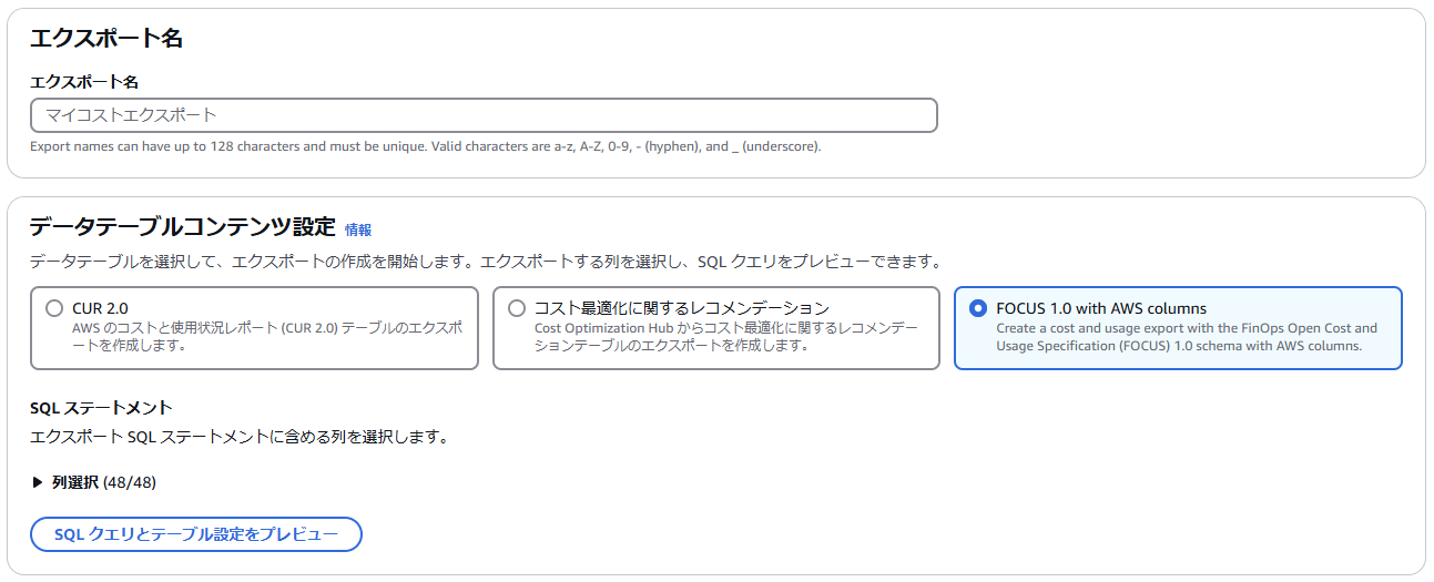 FOCUS 1.0 の一般提供版は、CUR 2.0 および Cost Optimization Hub の推奨事項に加えて、以下のスクリーンショットのように Data Exports の新しいテーブルとして利用可能です。既存の FOCUS 1.0 プレビュー版エクスポートは通常通り動作し続けます。ダッシュボードや分析ツールで用いるデータを一般提供版のデータへの切り替える準備として、一般提供版とプレビュー版のデータの違いを確認可能です。FOCUS 1.0 エクスポート を初めて作成する場合は、プレビュー版は使用せず一般提供版のエクスポートを使用してください。一般提供版は図1に続いて記載している改善により、FinOps アナリストチームへのコストダッシュボードの提供や、社内のコスト配分など、本番環境の FinOps ユースケースに AWS の FOCUS 1.0 エクスポートを使用できるようになりました。