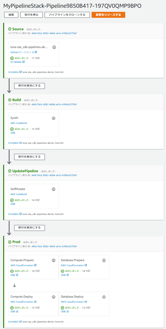 以後、パイプラインはレポジトリにPushされたCDKアプリケーションの構成に合わせて、自動的に再構成(self-mutation)されます。今回のComputeStackとDatabaseStackを含む例だと以下のようなパイプラインが作成されます。