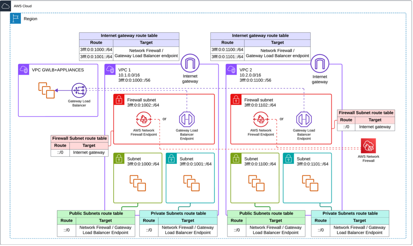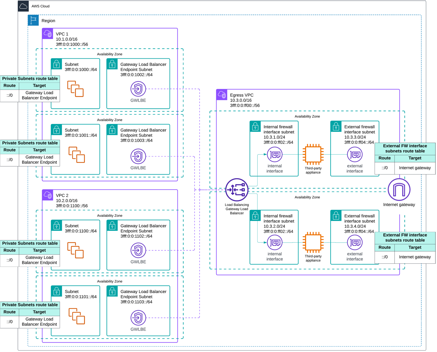 - 可観測性とロギング: VPC フローログを使用して、GWLB エンドポイント間の IPv6 トラフィックフローを監視することを検討してください。これにより、異常なパターンを特定し、環境間の接続問題をトラブルシューティングするのに役立ちます。