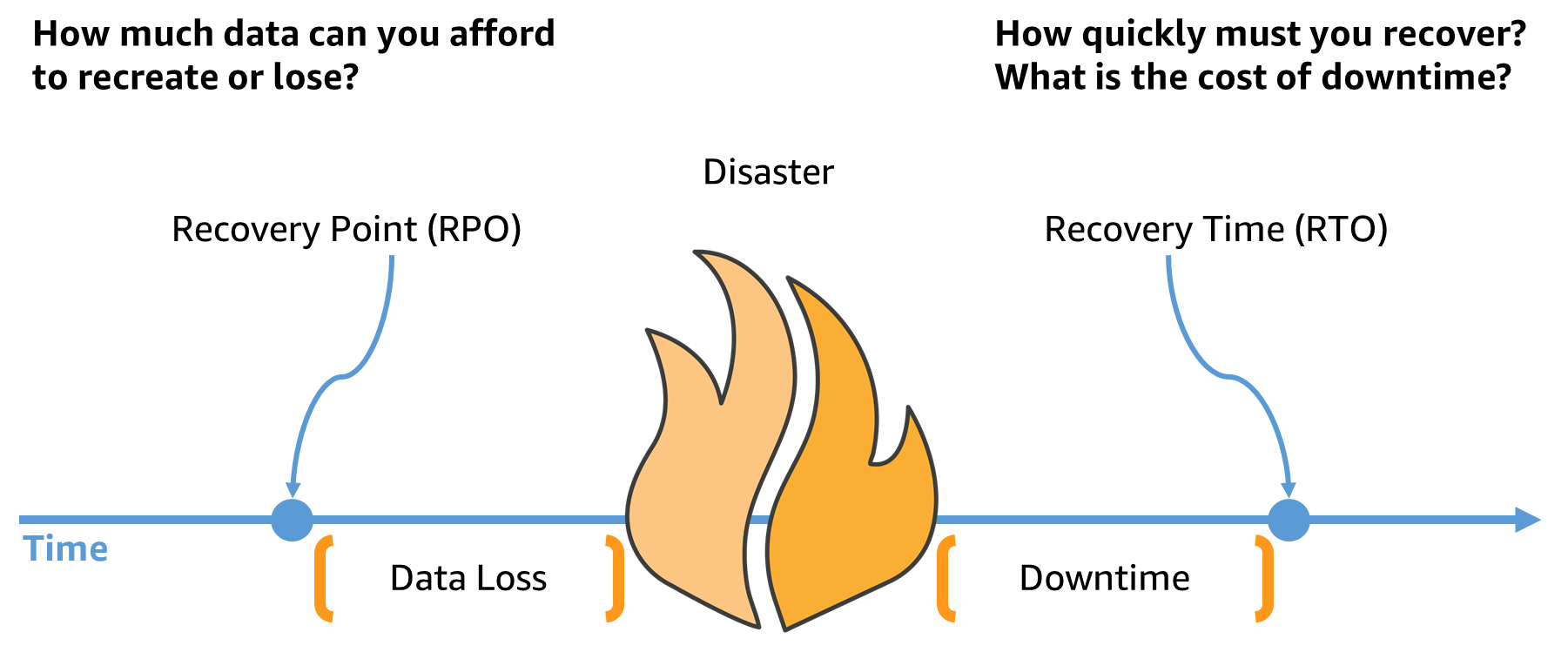- 目標復旧時点 (RPO): 最後のデータ復旧ポイントからの最大許容時間。これにより、許容できるデータの損失と見なされるものが決まります。