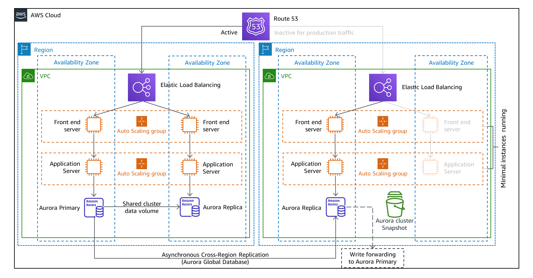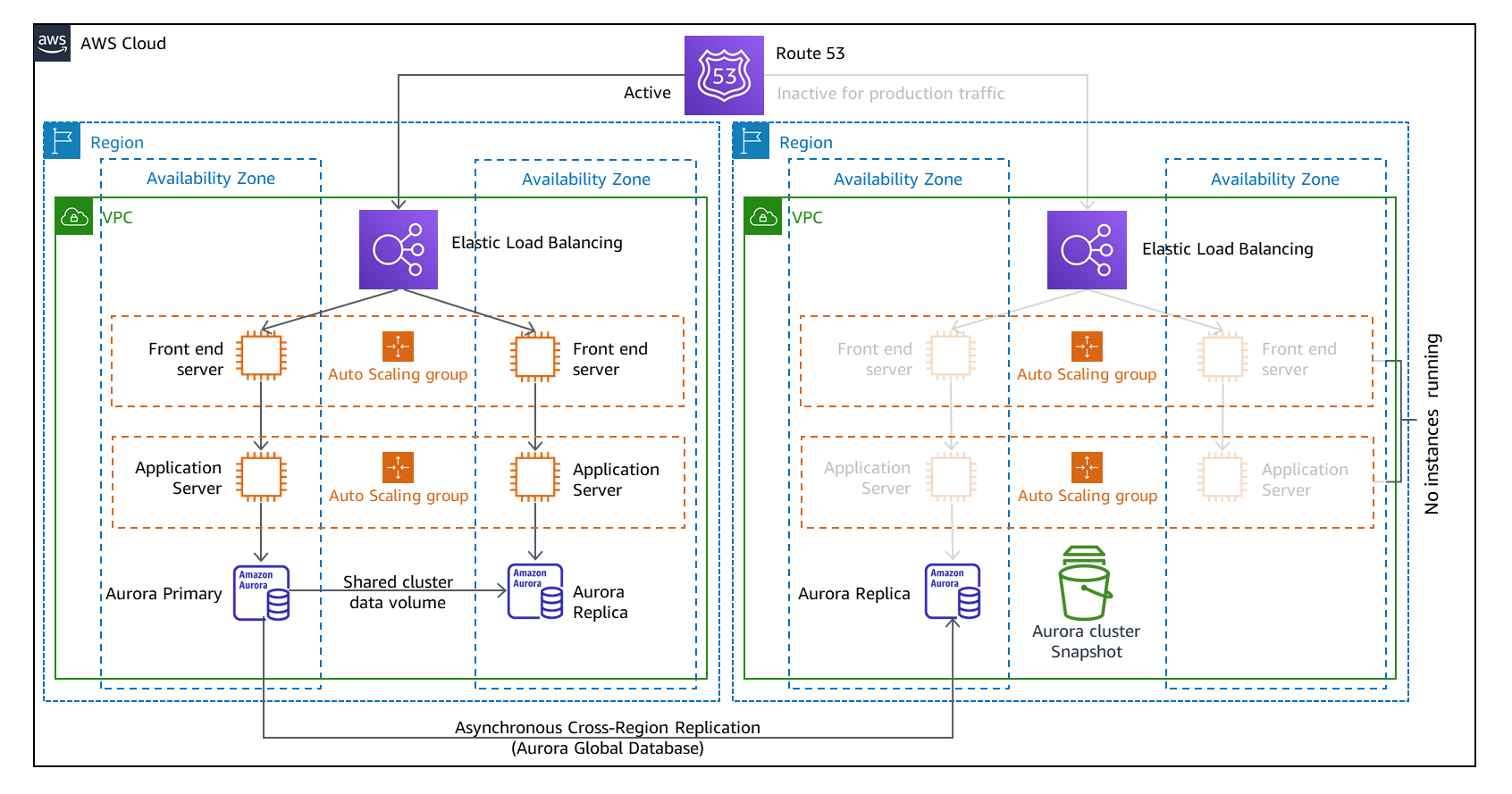 パイロットライト戦略では、データはライブですが、サービスはアイドル状態です。ライブデータとは、データストアとデータベースがアクティブなリージョンで最新(またはほぼ最新)であり、読み取り操作を処理する準備ができていることを意味します。図6では、Amazon Aurora グローバルデータベースが、リカバリリージョン内のローカルの読み取り専用クラスターにデータを複製しています。ただし、すべての DR 戦略と同様に、バックアップ(図6の Aurora DB クラスタースナップショットなど)も必要です。データを消去または破損する災害イベントの場合、これらのバックアップにより、最後の既知の良好な状態に「巻き戻す」ことができます。