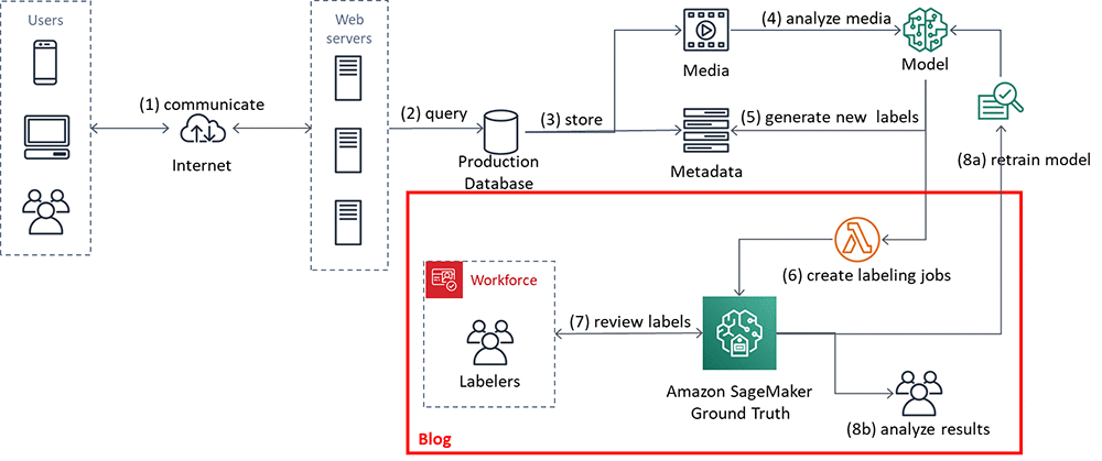 - Ground Truth は、ワーカーがラベル付けしたデータをラベリング後の Lambda 関数 (6) に送信します。この関数は、ワーカーが割り当てたラベルを DynamoDB ラベルテーブルに書き込みます (7)