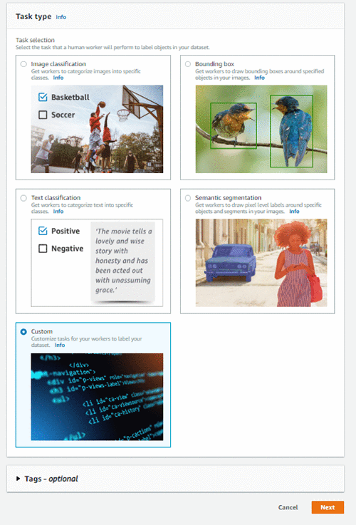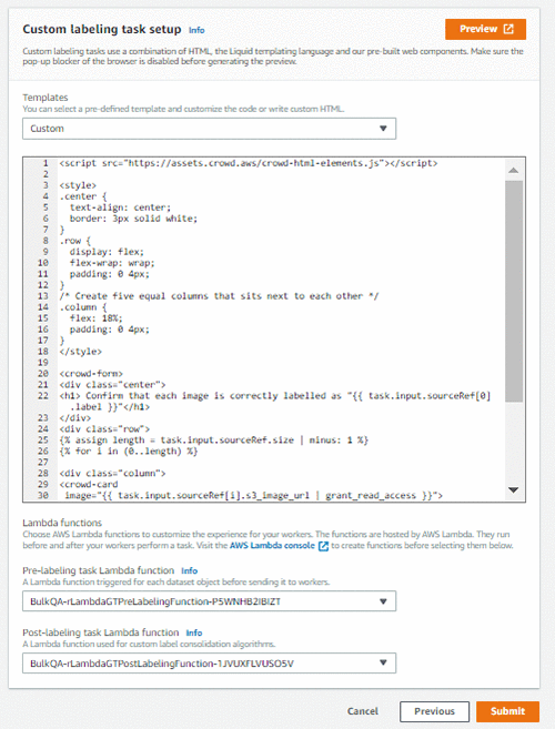 - カスタムのラベル付けタスクテンプレート。 テンプレートは、ラベリングタスク中にワーカーに表示される内容を定義します。 タスクへの入力は、ラベリング前の Lambda 関数によってテンプレートで使用できるようになります。