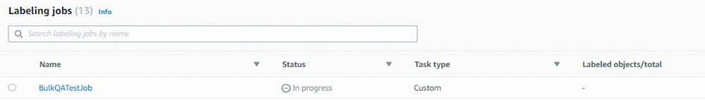 Ground Truth があなたの処理の動作検証を行うまで数分間待ちましょう。 数分後、UI の Labeled objects/total 列に、0 / 9 などのカウントが更新されて表示されます。合計は、ワーカーが品質保証を行う Ground Truth カスタムラベリング入力の数です。ここでは、QA バッチサイズで選択したサイズに応じて、各クラスラベルは 1 つ以上の画像になります。
