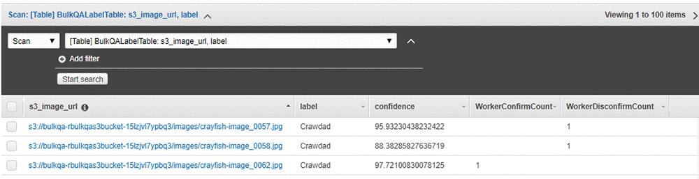 背後では、ラベリング後の Lambda 関数が実行されます。 この Lambda 関数は、確認結果で DynamoDB テーブルを更新します。 各行に最大 2 つのフィールドを追加します。WorkerConfirmCount と WorkerDisconfirmCount です。 これらの列には、個々の画像を確認または却下したレビュー担当者の数が設定されます。