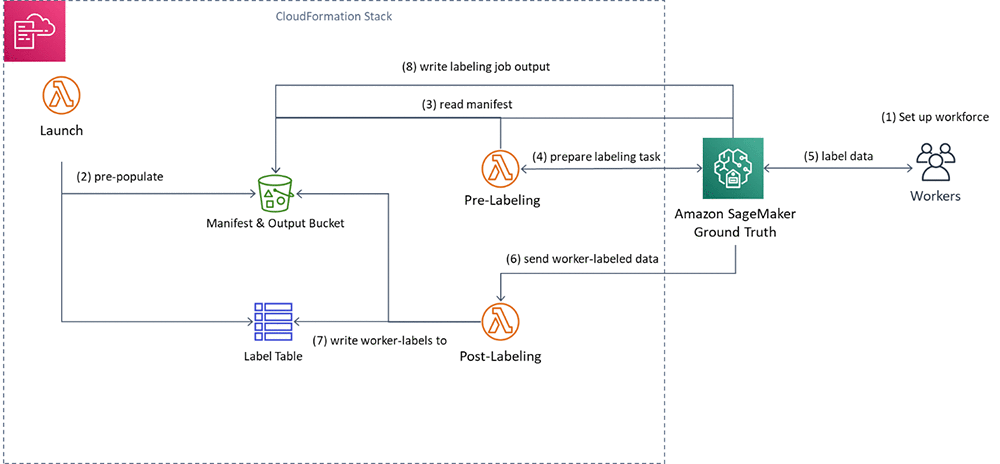 - Ground Truthは、ラベリングタスクをラベリング前の Lambda 関数に送信してラベリングタスクを準備し、それらをワーカーに送信します(4)。