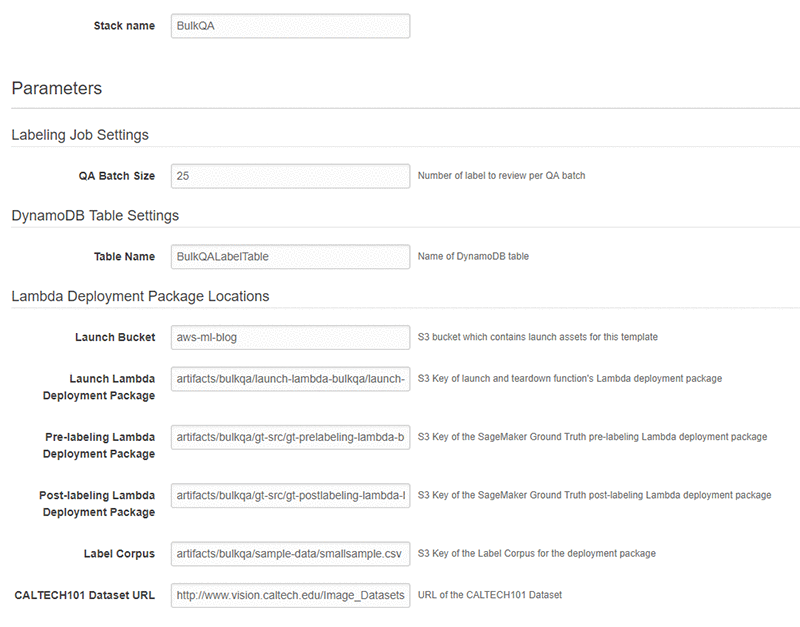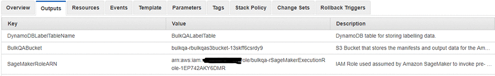 - スタックが作成したリソースは、Amazon Simple Storage Service(S3)バケット(キー = BulkQABucket)です。 このバケットには以下が含まれます。