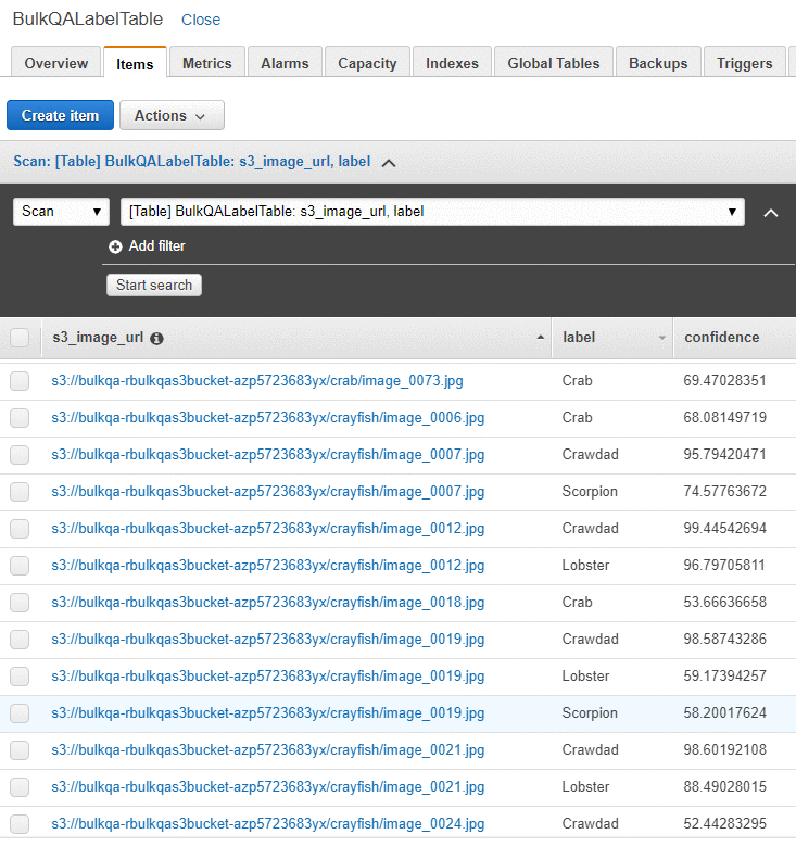すべてのタスクが完了したら、DynamoDB テーブルで最終結果を確認できます。 AWS マネジメントコンソールで、Amazon DynamoDB コンソールに移動します。Tables で、前に作成した BulkQALabelTable を選択します。 Itemsタブを選択し、ワーカーの確認とともにテーブルを確認します。