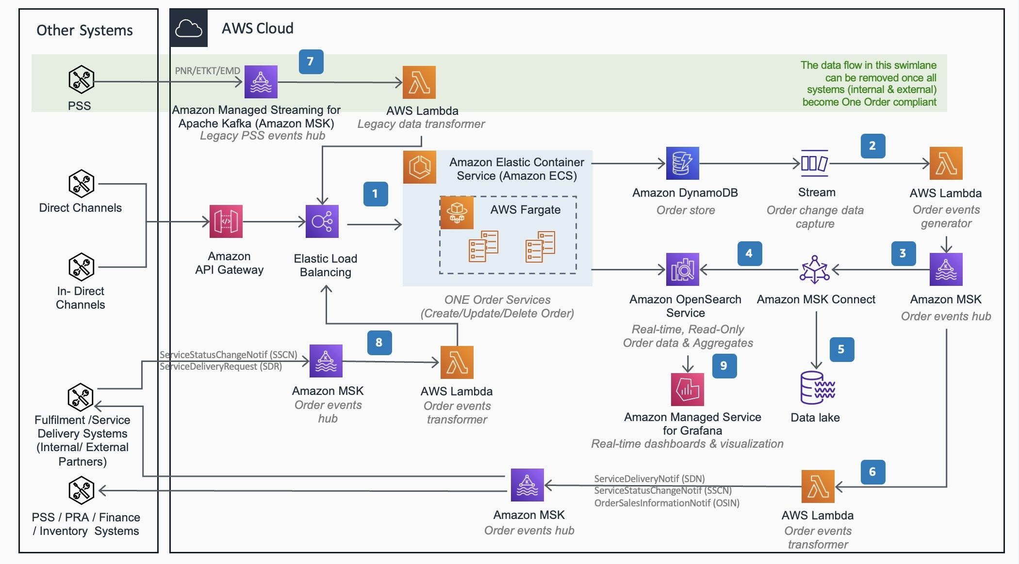 このアーキテクチャは、双方向のイベント交換メカニズムを提供することで、既存の PNR ベースの PSS システムとの共存を可能にし、従来の PSS システムで発生した変更と注文データの同期を保証します。