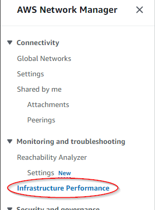 AWS コンソールから Network Manager を選択し、Infrastructure Performance を選択してください: