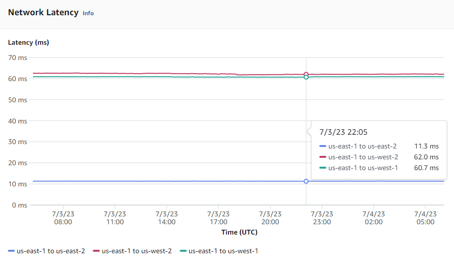この場合、地理的な距離が短いため、us-east-1 (バージニア北部) と us-east-2 (オハイオ) 間のネットワーク遅延が最も低いことが観測されます。