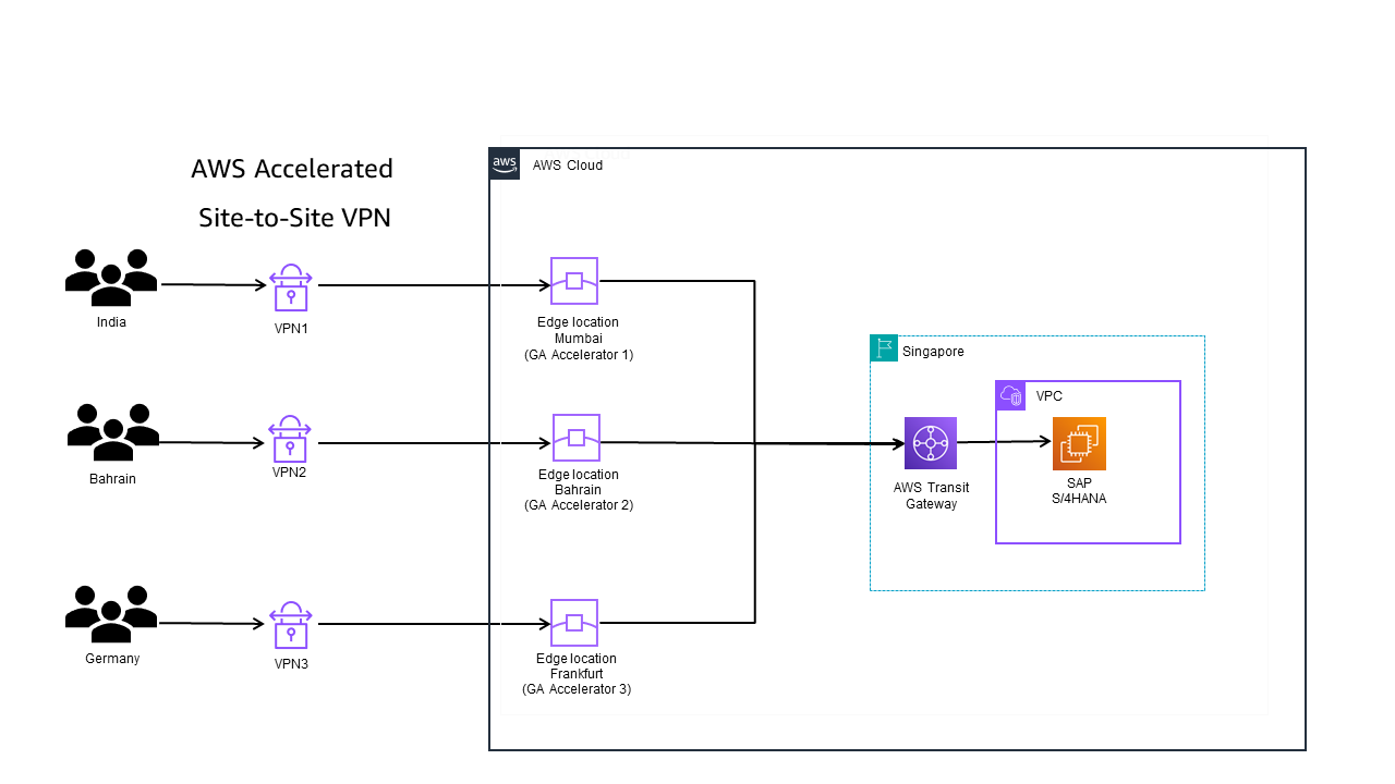 地理的に分散したリモートユーザーが SAP システムにアクセスしようとする場合はどうでしょうか。例えば、ヨーロッパのユーザーがインターネットを介して AWS シンガポールリージョンの SAP システムにアクセスすると、ネットワークのパフォーマンスが予測できず、ユーザー体験が低下する可能性があります。