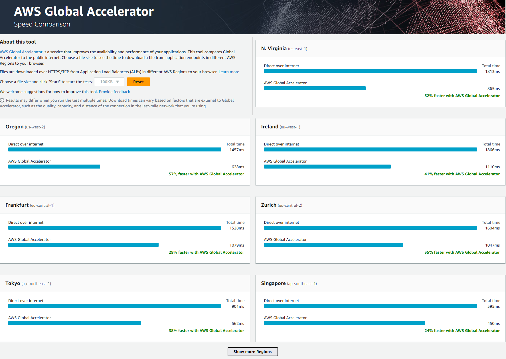 リモートの SAP ユーザーに AWS Global Accelerator が有益かどうかを判断するには、AWS Global Accelerator Speed Comparison ツールを使用して様々な AWS リージョンへのネットワーク待ち時間を測定できます。このツールを SAP ユーザーの場所で実行すると、AWS Global Accelerator がネットワークトラフィックを最も近い AWS エンドポイントに向けるため、既存のインターネット接続と待ち時間を比較できます。複数回テストを実行すると結果が異なる場合があることに注意してください。ダウンロード時間は、お使いの最終回線ネットワークの品質、容量、距離など、Global Accelerator 以外の要因によって変動する可能性があります。