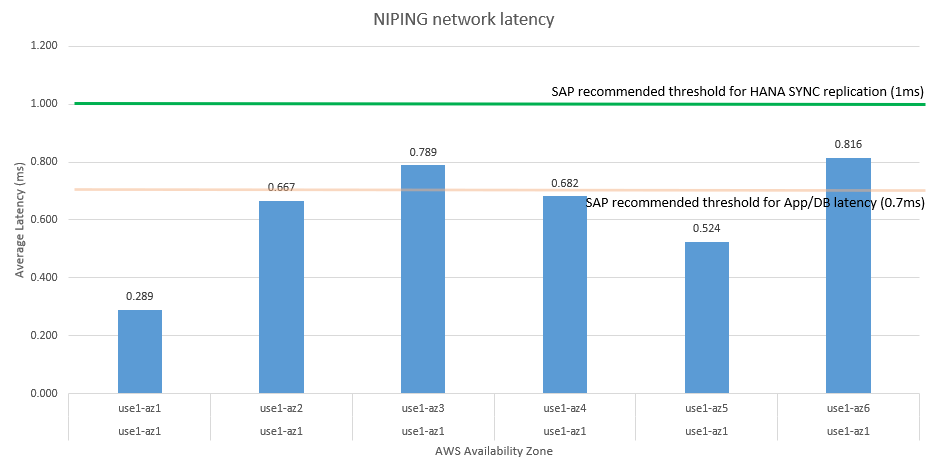 NIPING の結果は、AZ1 から AZ2-AZ6 までの AZ 間のネットワーク遅延を 0.7 ms の閾値に対して相対的に示しています。
