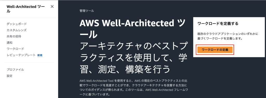 1. まず、AWS マネジメントコンソールに移動し、AWS Well-Architected Tool コンソールを開いて「ワークロードの定義」を選択します。