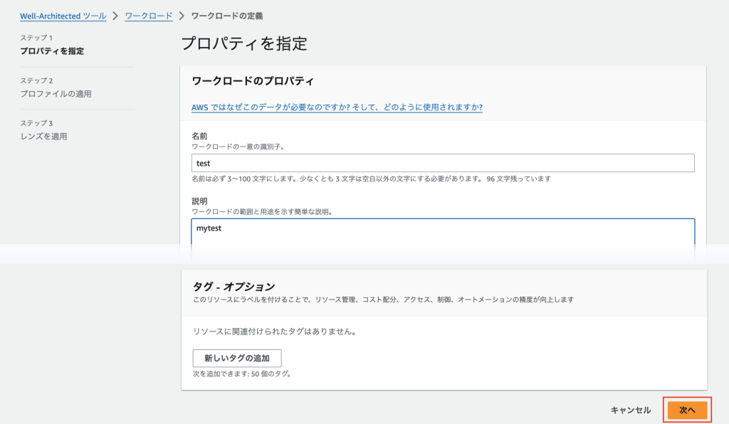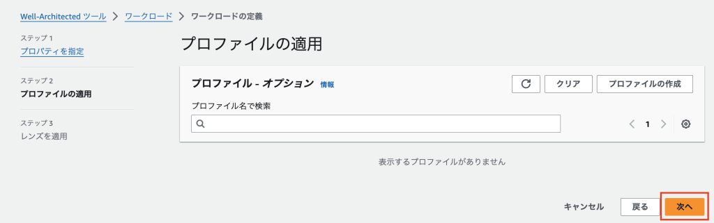 3. プロファイルを利用して、組織の特定の優先事項に基づいて Well-Architected Framework Review (WAFR) をカスタマイズすることができます(任意の手順)が、今回は何も設定せず「次へ」を選択します。