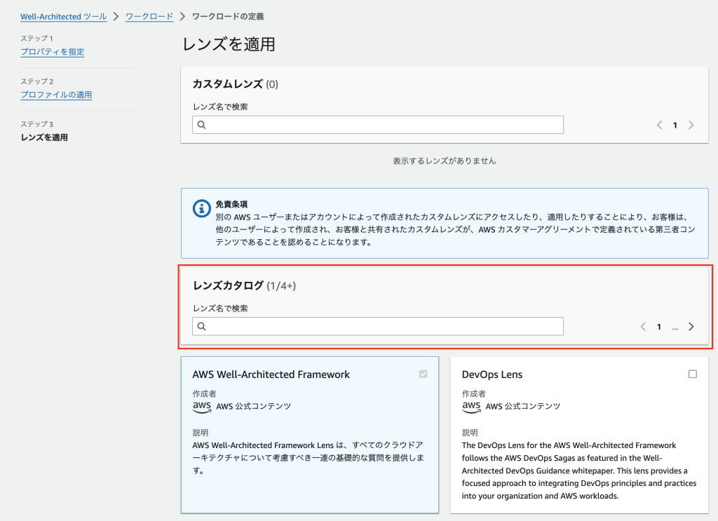 4. レンズを適用ページでは、カスタムレンズとレンズカタログが表示されます。レンズ名で検索したり、カタログを見てレンズを見つけて選択することができます。その後、「ワークロードの定義」を選択します。