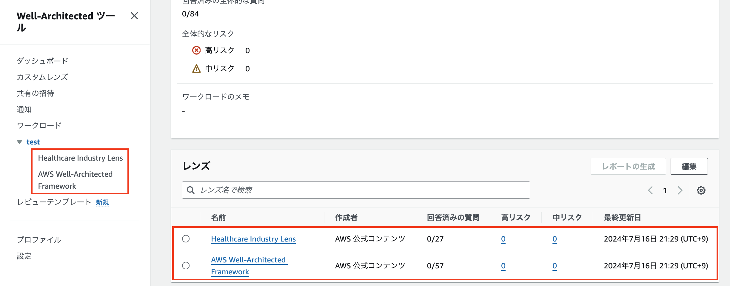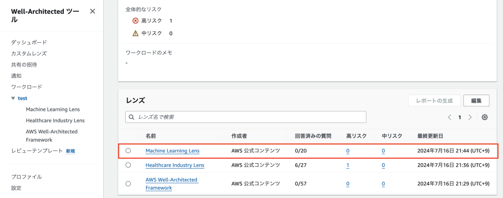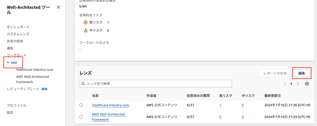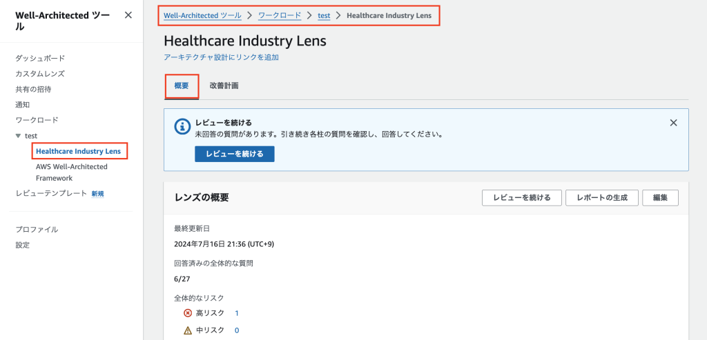 5. ワークロードが作成されたら、画面左側のナビゲーションペインでどのレンズが適用されているかを確認できます。また、ワークロード概要ページを下にスクロールすることでも、適用されているレンズを確認できます。