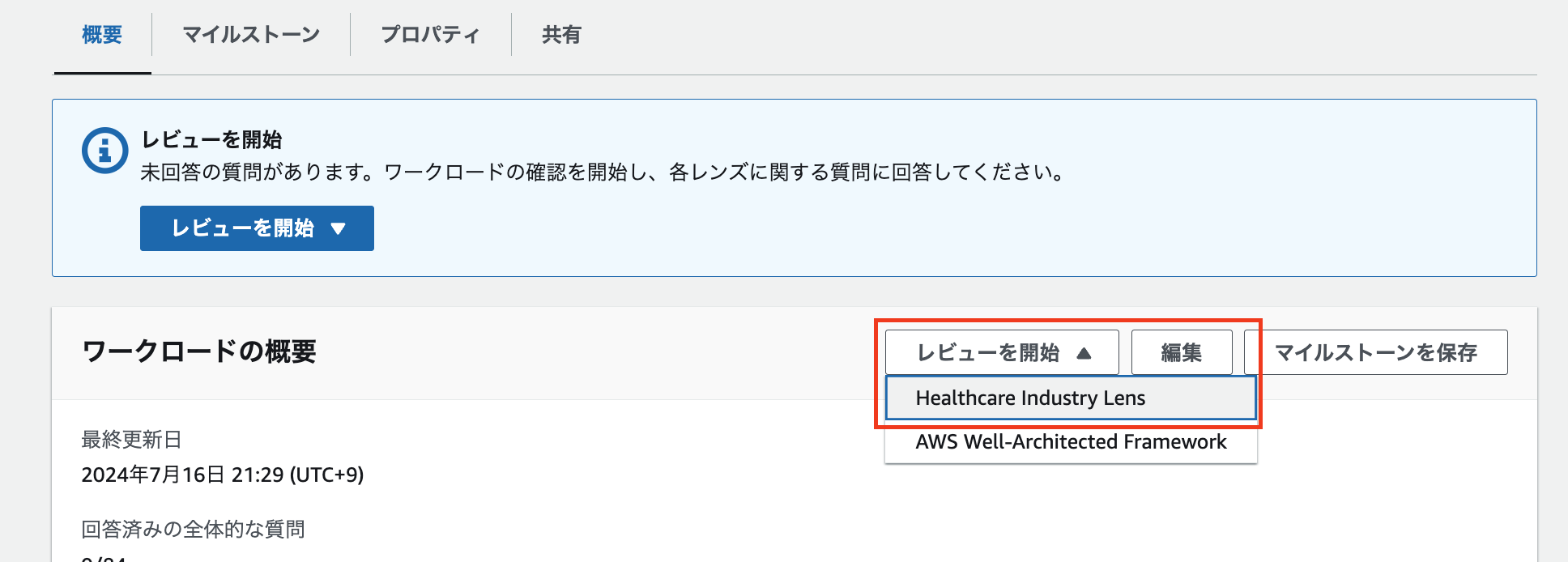 1. ワークロードの定義ができた後、ヘルスケア業界のレンズを使ってレビューを開始します。ワークロードページで、「レビューを開始」のドロップダウンリストから「Healthcare Industry Lens」を選択します。