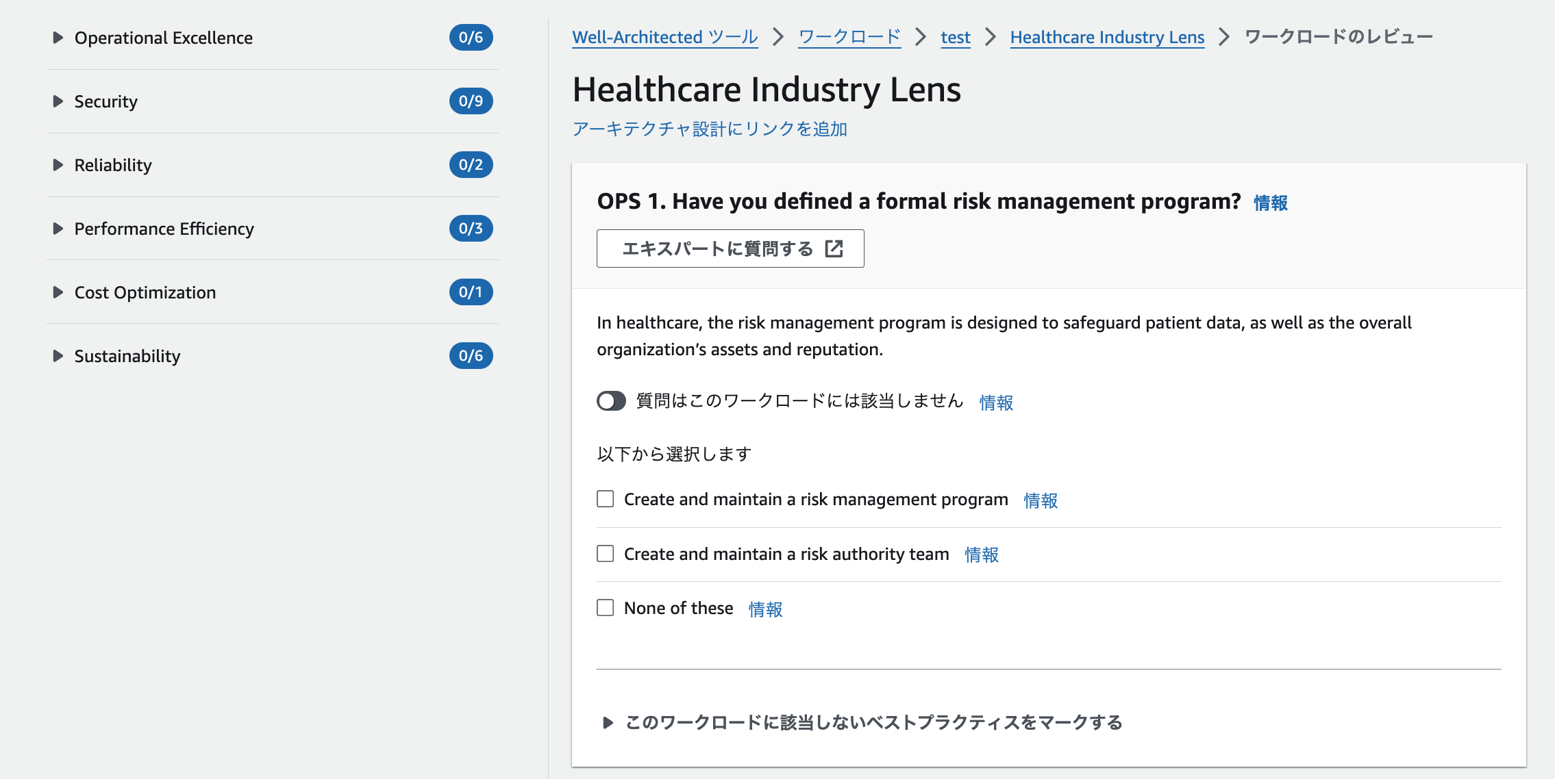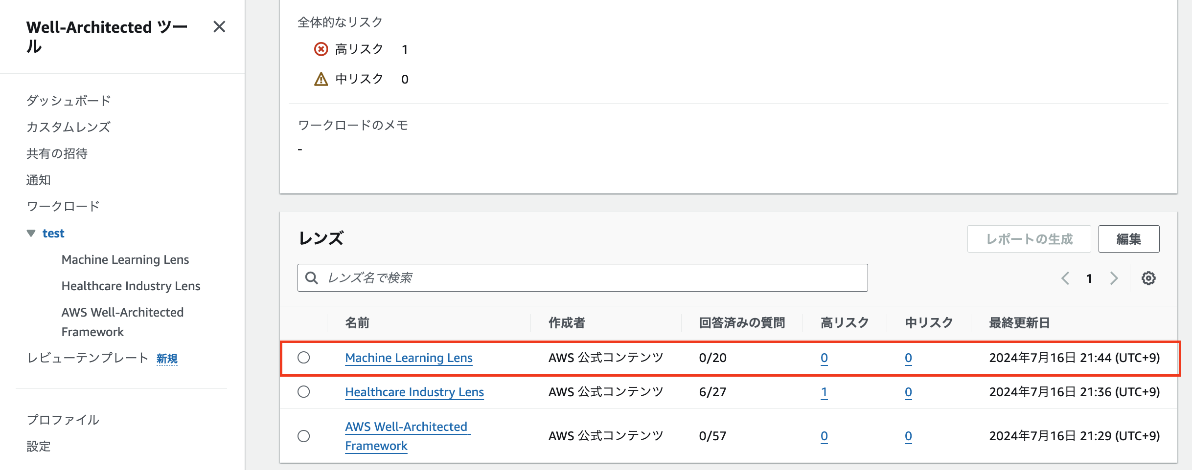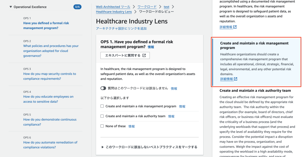 4. レンズとワークロードを比較し、各質問でワークロードがベストプラクティスに適合しているかチェックすることができます。選択したレンズの質問に答え終えたら、レンズの概要ページに移動して、特定されたリスクを確認できます。