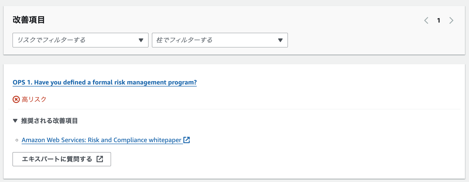 スクロールダウンすると、リスクレベルや柱でフィルタできる「改善項目」が表示され、改善項目毎に「推奨される改善項目」にリスクを軽減するための手引きが示されます。