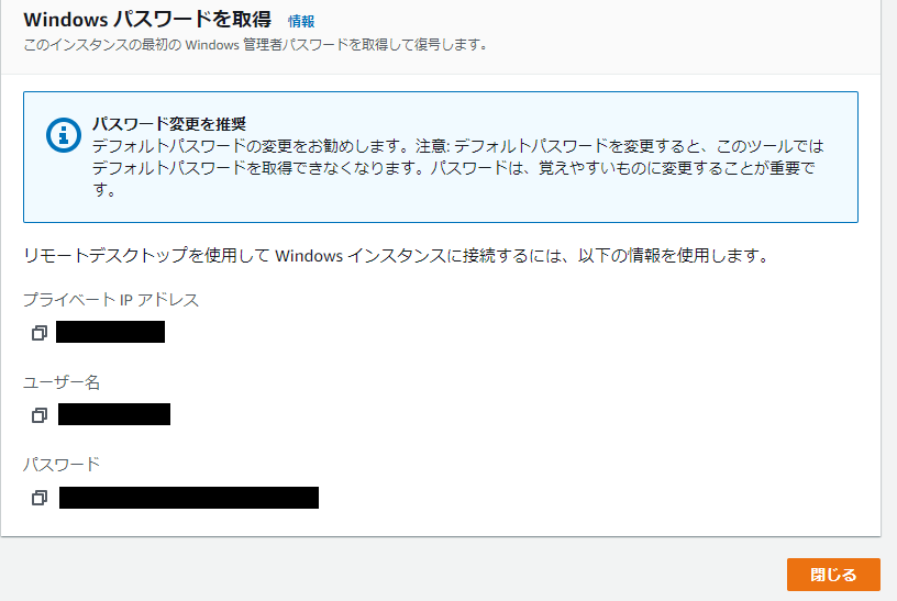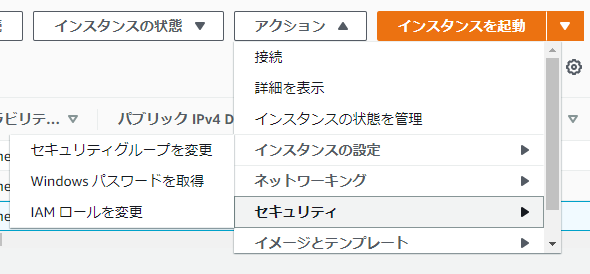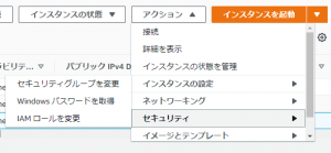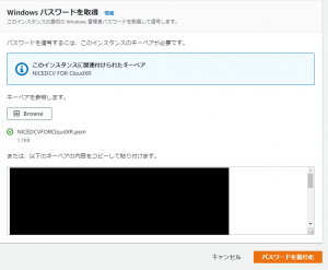 対象のインスタンスを選択し、アクションからセキュリティ>Windowsパスワードを取得を押下